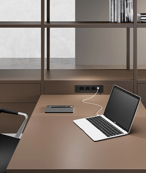 Dieses Merkmal gewährleistet, dass die Dicke der Mehrfachsteckdose auf ein Minimum reduziert und an verschiedene Installationskonfigurationen angepasst werden kann, indem der Ausgang von Strom- und Datenkabeln sowohl horizontal als auch vertikal möglich ist.