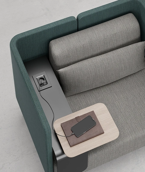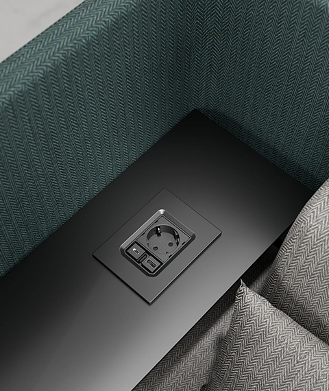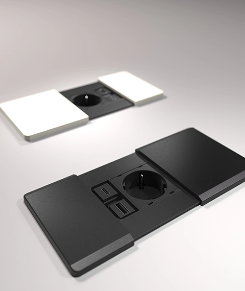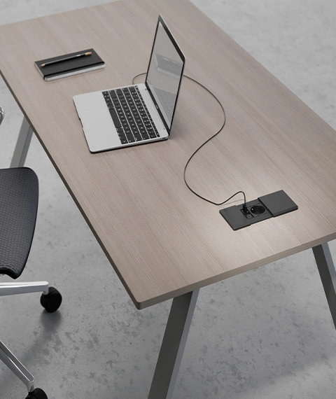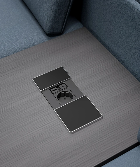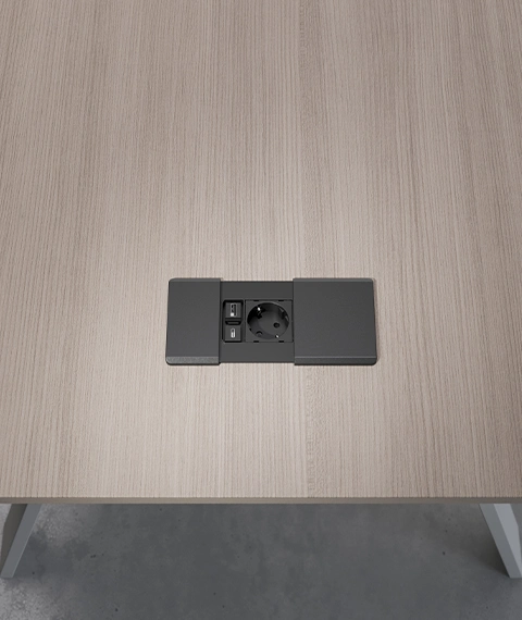 VersaPad ist so konzipiert, dass nur die aktive Stromsteckdose zugänglich ist, während die nicht genutzten Medienanschlüsse abgedeckt und geschützt bleiben.