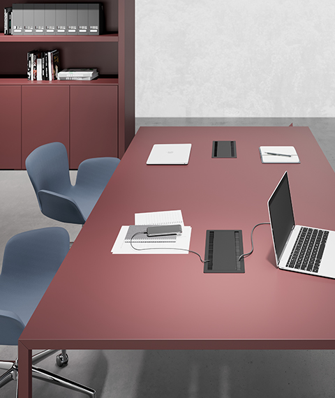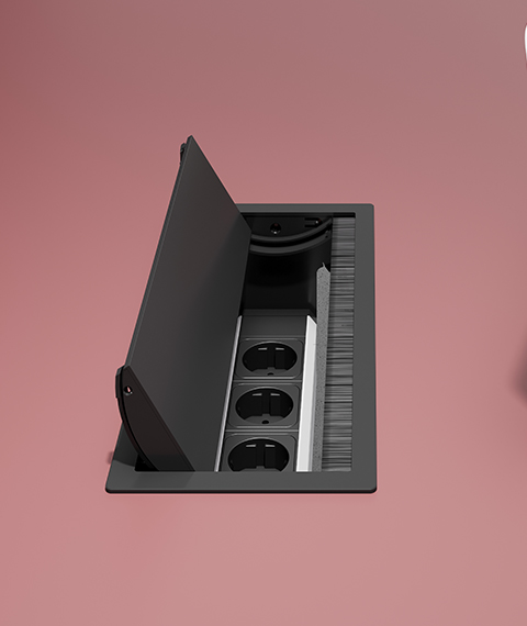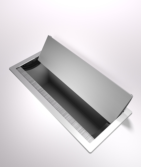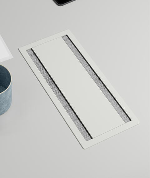 Exit Dual 2.0 es el pasacables que destaca por sus líneas elegantes y limpias. Su marco integral de aluminio lo hace adecuado para mesas de reuniones y salas executivas.