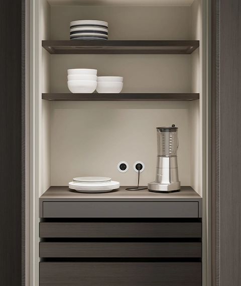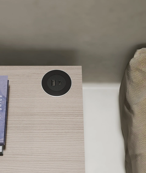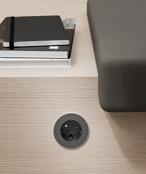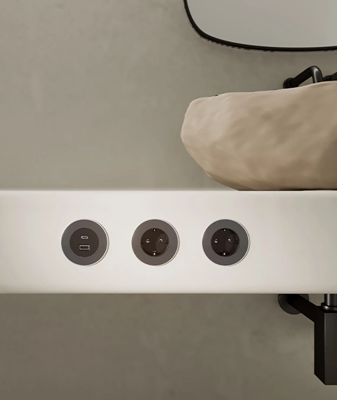VersaDot, avec une profondeur de 56 mm et un diamètre d'installation de 60 mm et un design minimal, s'intègre aisément dans divers types de meubles, que ce soit lors de la conception ou par la suite, offrant design et ergonomie à différents environnements.