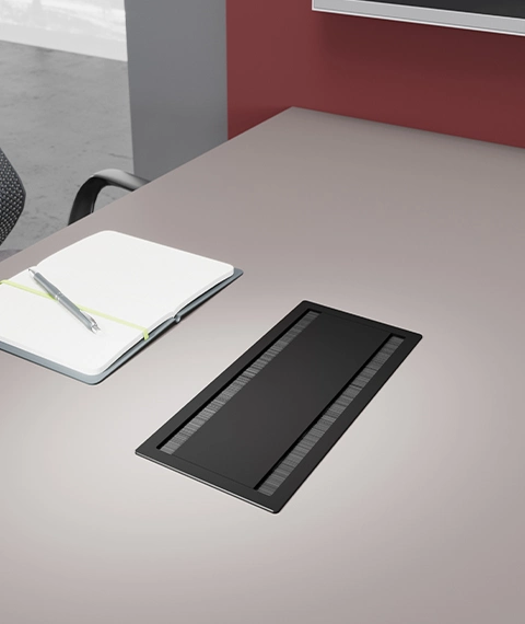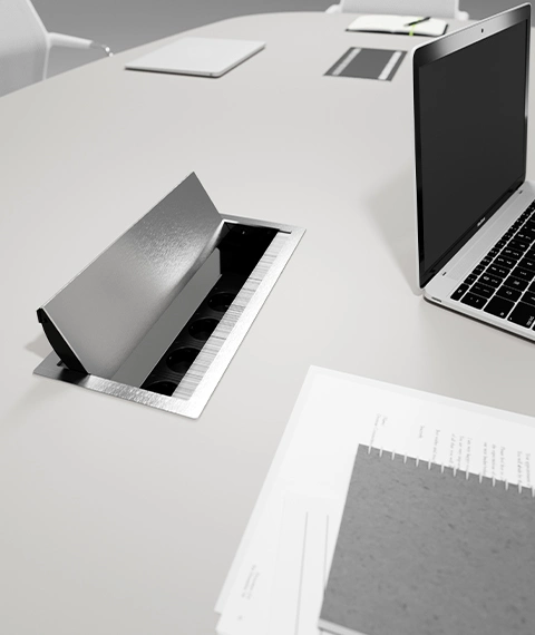 Le modèle Dual 2.0 de la gamme VersaFlap a été spécialement conçu pour les tables de réunion et les bureaux partagés. Grâce à son mécanisme basculant, les utilisateurs peuvent accéder facilement aux prises électriques des deux côtés.