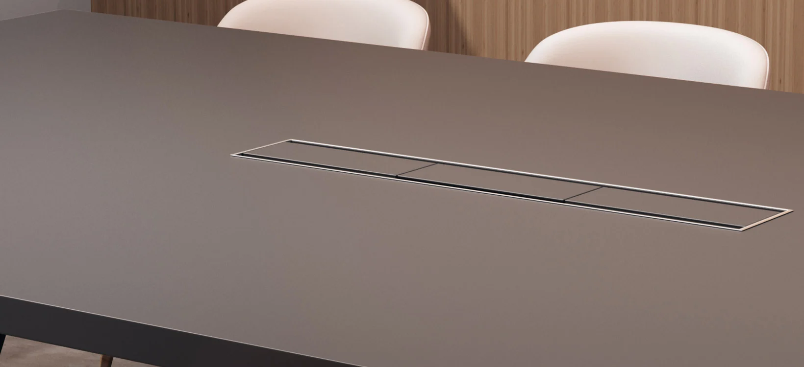 Grazie alla possibilità di avere la finitura dello sportello in qualsiasi materiale, compresa la stessa essenza del piano di lavoro, Exit Fly Dual è la soluzione ideale per gestire i cavi nelle postazioni di particolare prestigio.