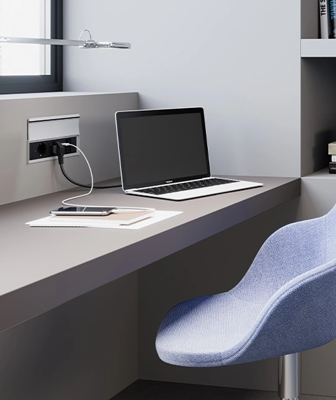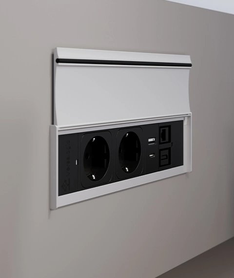 VersaLid features an elegant aluminium flap which, once closed, protects the sockets from dust and leaves the workplace free and tidy.