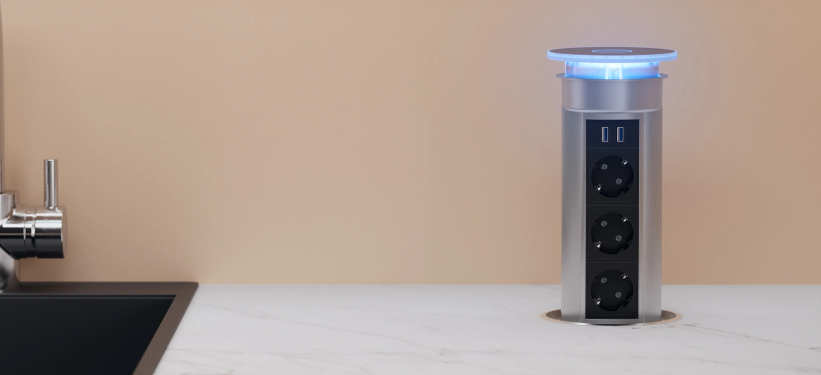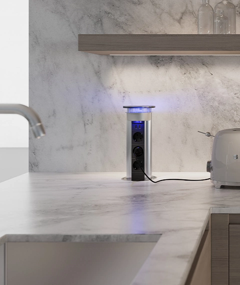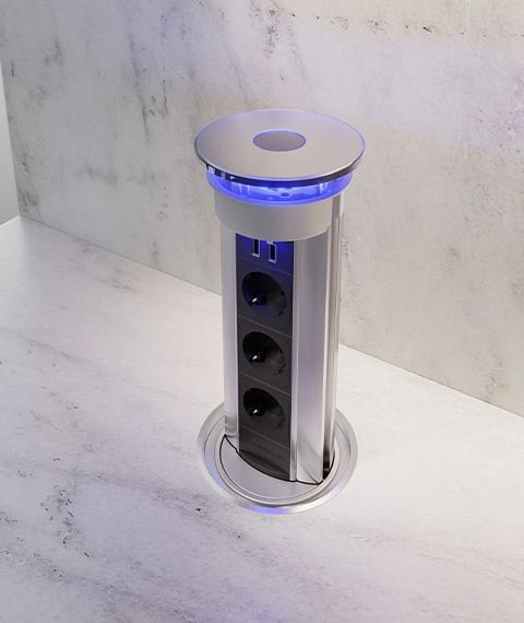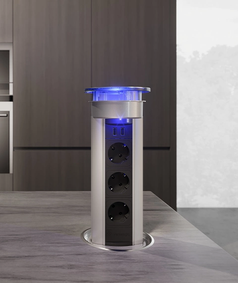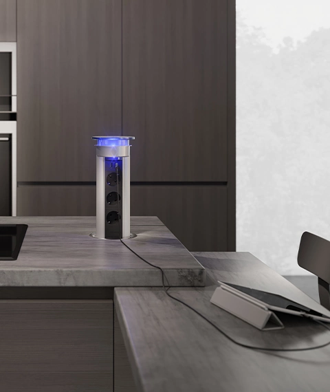 VersaLux is a power supply tower designed for kitchens, bringing power and multimedia capabilities to the island modules.